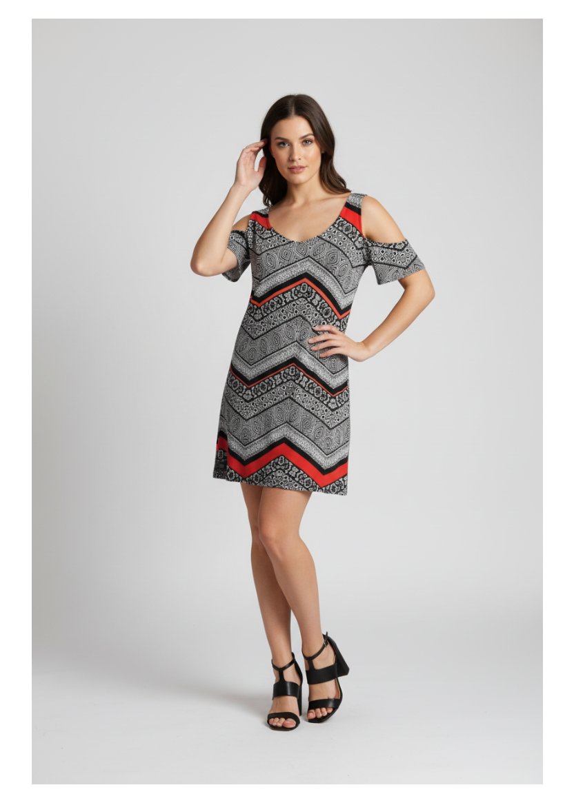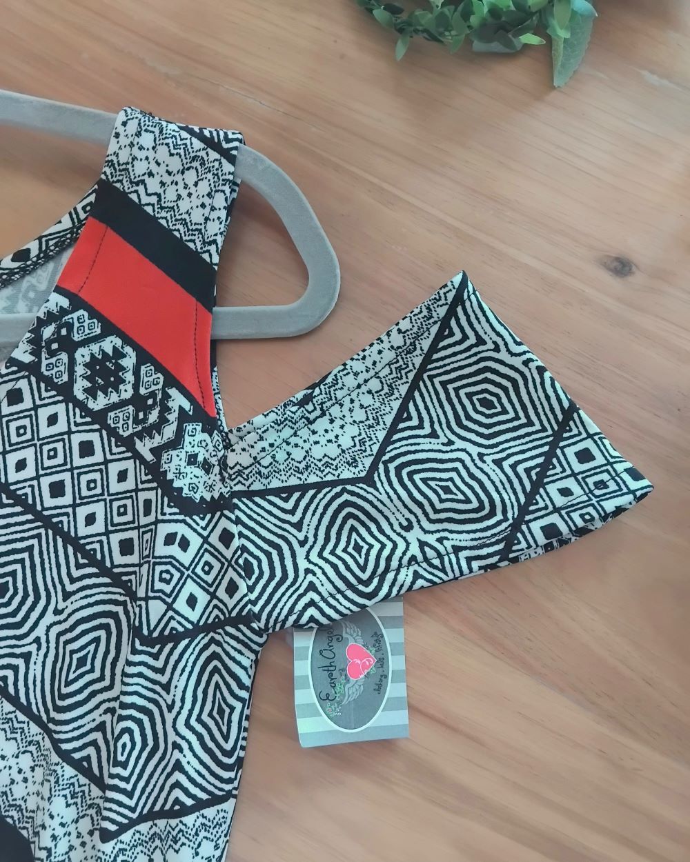 Elegant open shoulder summer dress in striking black, white & orange. Perfect for warm day & evenings. Wear solo or with leggings. Size large available.
