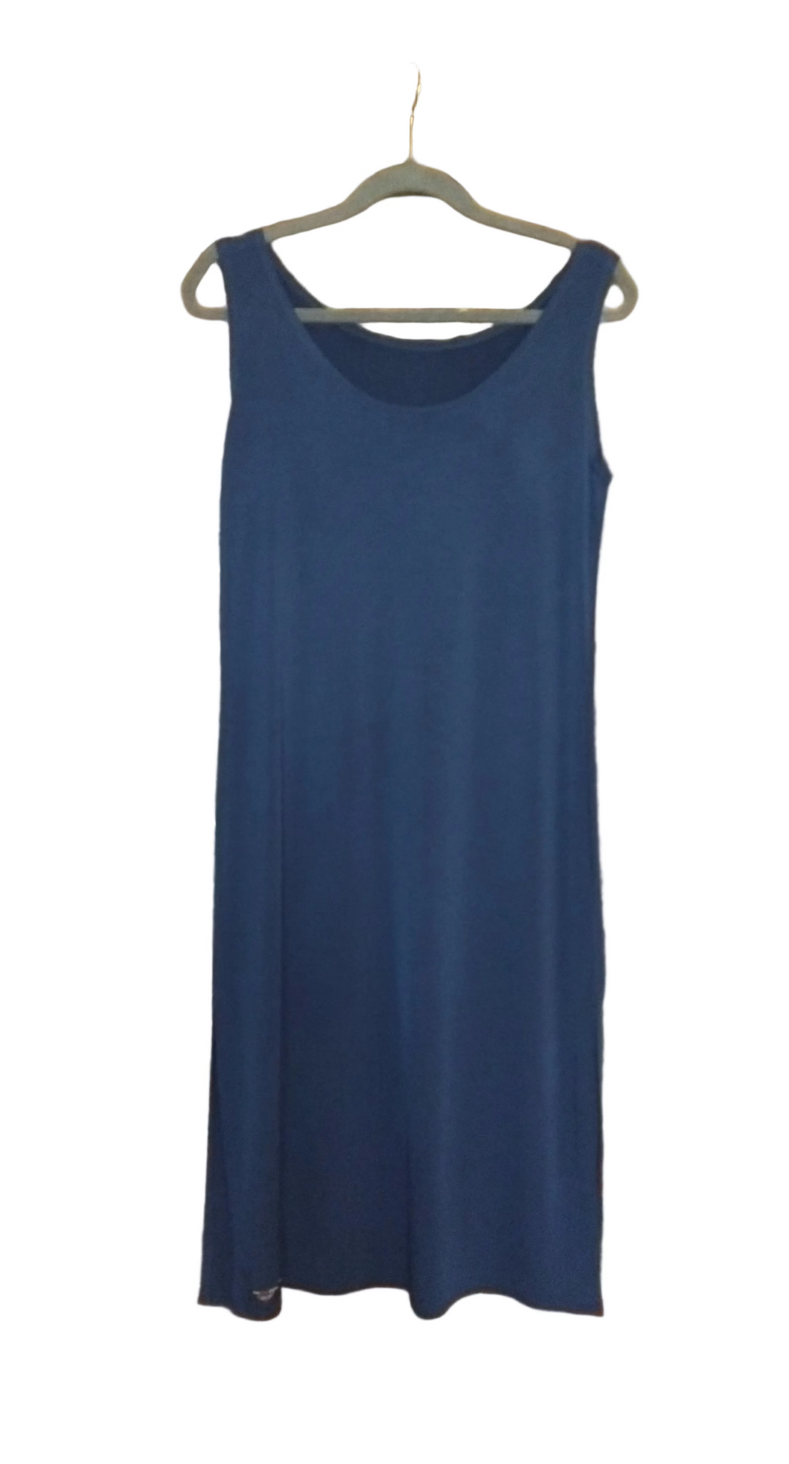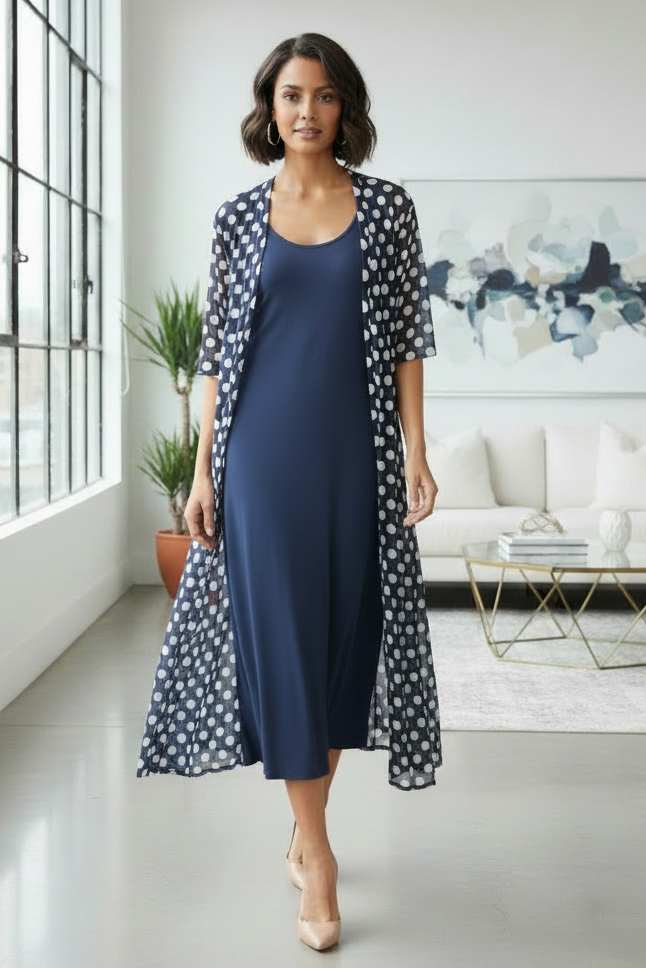 Elegant long navy tunic dress paired with navy & white polkadot mesh jacket. Earth Angel Clothing set in size large. Perfect for sophisticated style.